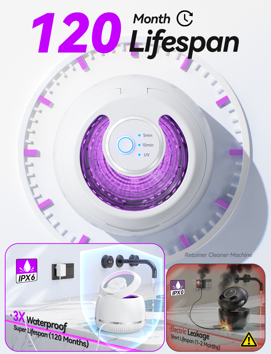 Durable and Waterproof, for Long-lasting Companionship: Featuring IPX6 waterproof ultrasonic cleaner retainer. The integrated process extends the product's lifespan to over 10 years. Equipped with NTC temperature control ultrasonic cleaner retainer: The cleaning temperature is maintained below 50°C, ensuring gentle cleaning while prolonging the lifespan of items such as retainers. |